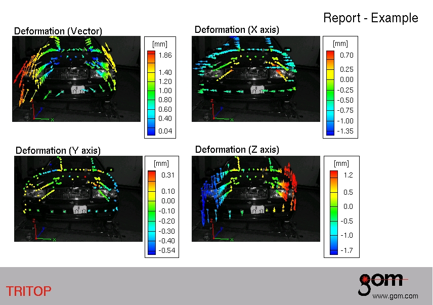 Optické skenery dostupné na ÚADI mohou být využity rovněž pro měření deformací (především specializovaný modul systému Tritop je pro tyto účely vhodný). V různých zatěžovacích stavech jsou zjišťovány polohy referenčních bodů, z nichž je následně určena příslušná deformace. Jako příklad deformačního měření optickými skenery může být měření torzní tuhosti karoserie. Tento typ deformačního měření byl na několika vozidlech na ÚADI úspěšně realizován.