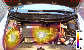 Pro bližší identifikaci zdrojů hluku je možné užít akustickou kameru, která pomocí mikrofonního pole v reálném čase zobrazuje a zaznamenává informace o měřené součásti ve formě obrazu, potaženého barevnou mapou, jasně indikující zdroje hluku.
